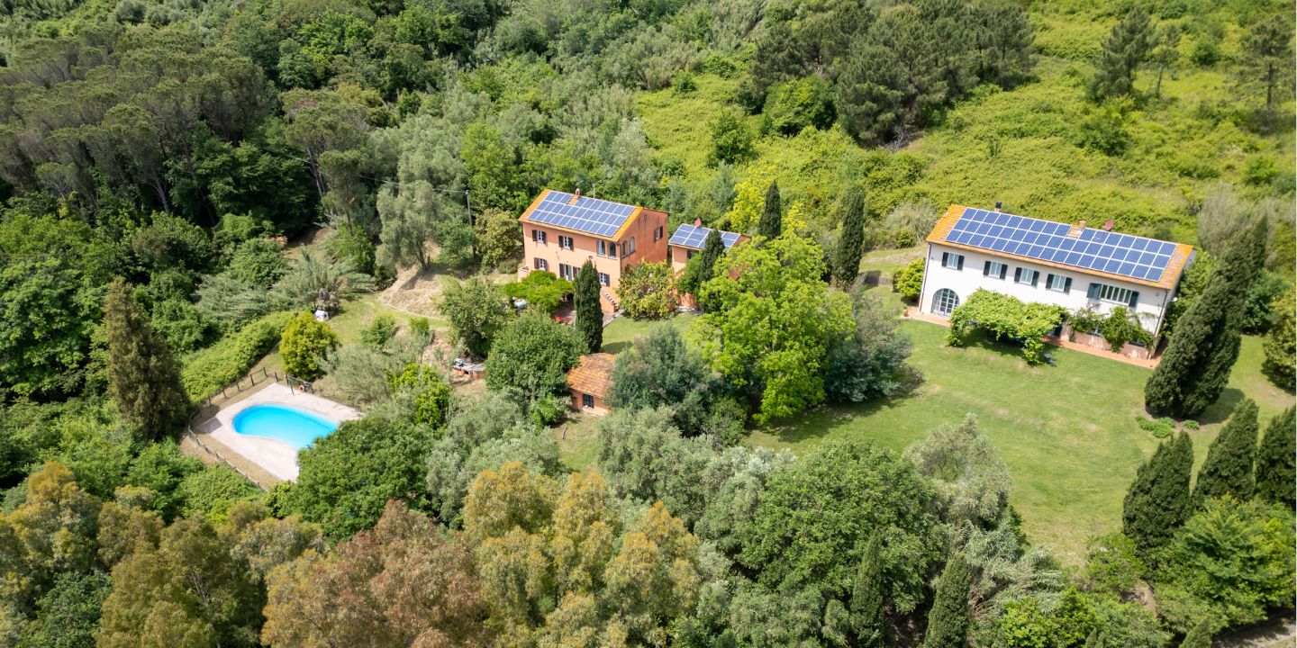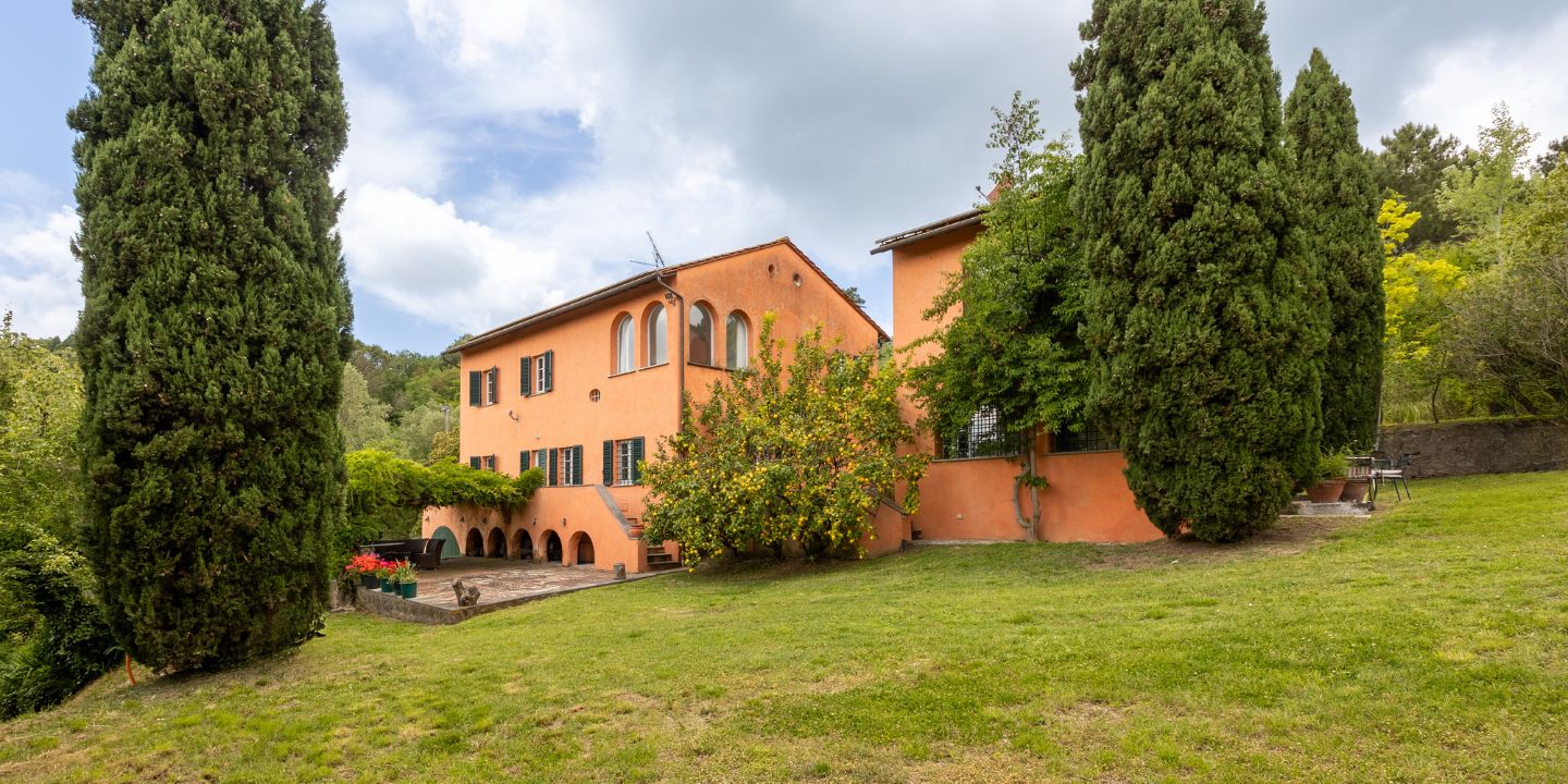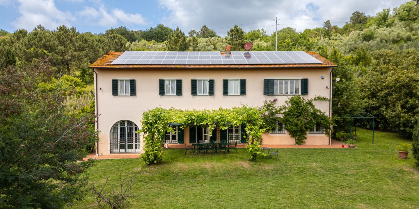 Un vialetto immerso nel verde introduce all’interno della tenuta, offrendo sin da subito la sensazione di entrare in un’oasi privata. I terreni collinari ospitano oliveti, alberi da frutto e boschi di querce, lecci e pini, attraversati da sentieri ideali per piacevoli passeggiate e accompagnati dal suono rilassante di un piccolo ruscello. La vista panoramica abbraccia la valle del Serchio e i Monti Pisani, che separano Pisa da Lucca, regalando scorci di straordinaria bellezza naturale.