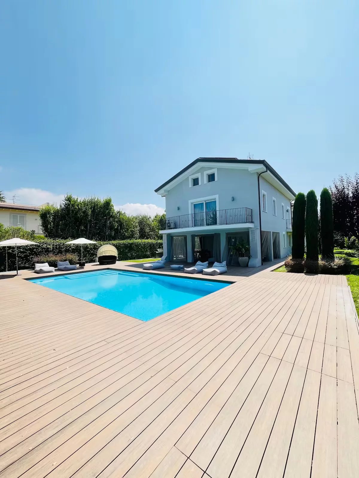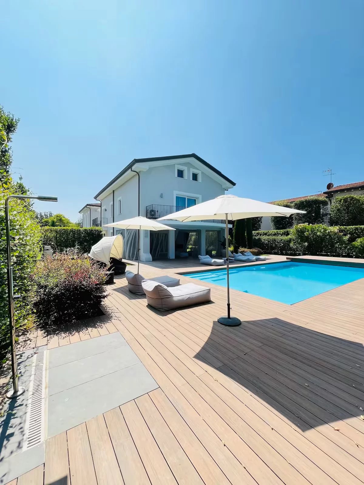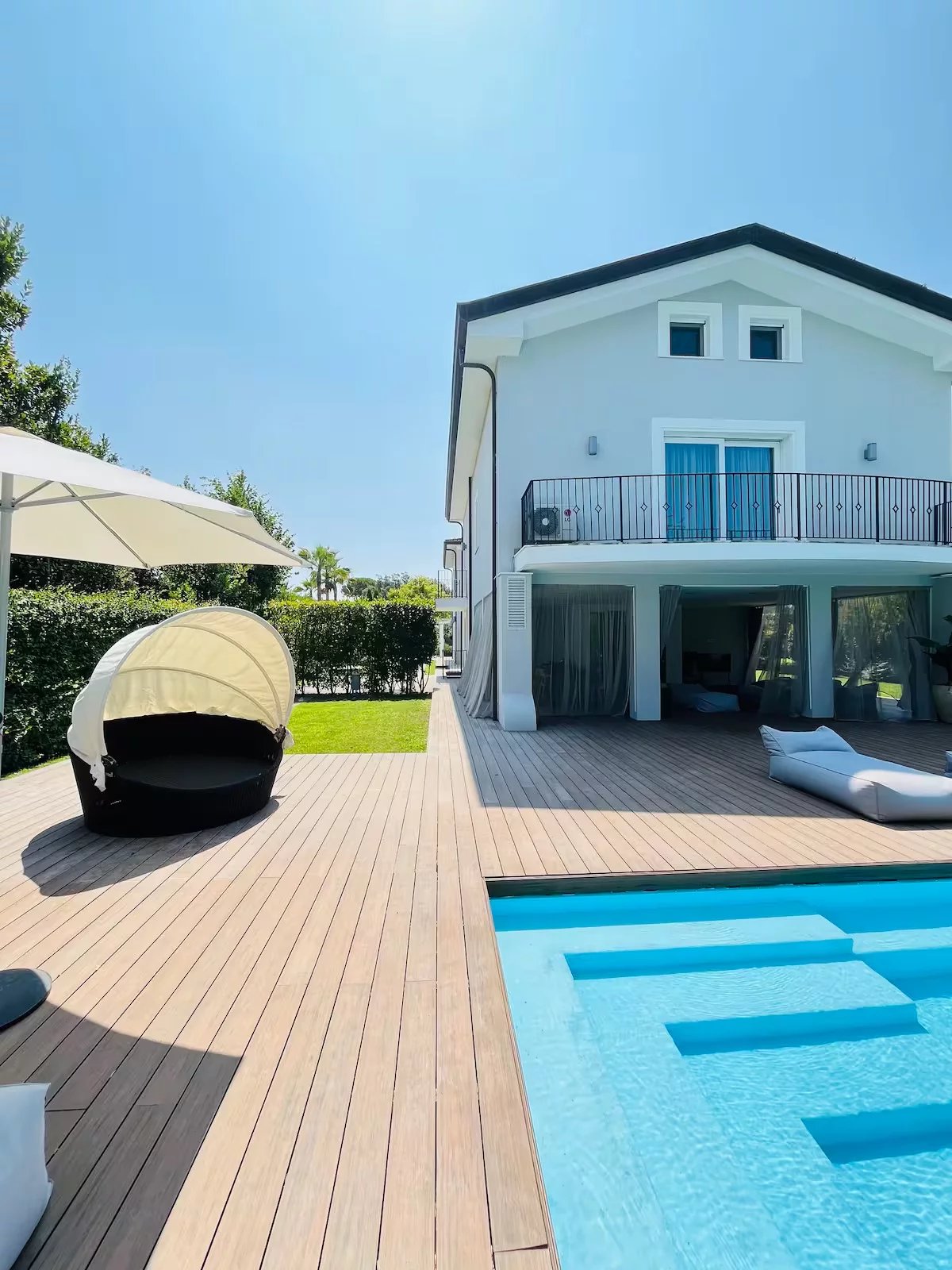 Gli spazi esterni sono un’estensione naturale della villa. La piscina di 5,5 x 11 metri è circondata da una piattaforma in teak che conduce a un elegante patio coperto, arredato con divani, poltrone e lettini, oltre a una cucina outdoor con grill e lavandino. L’area è protetta da zanzariere e dotata di filodiffusione e connessione Wi-Fi.