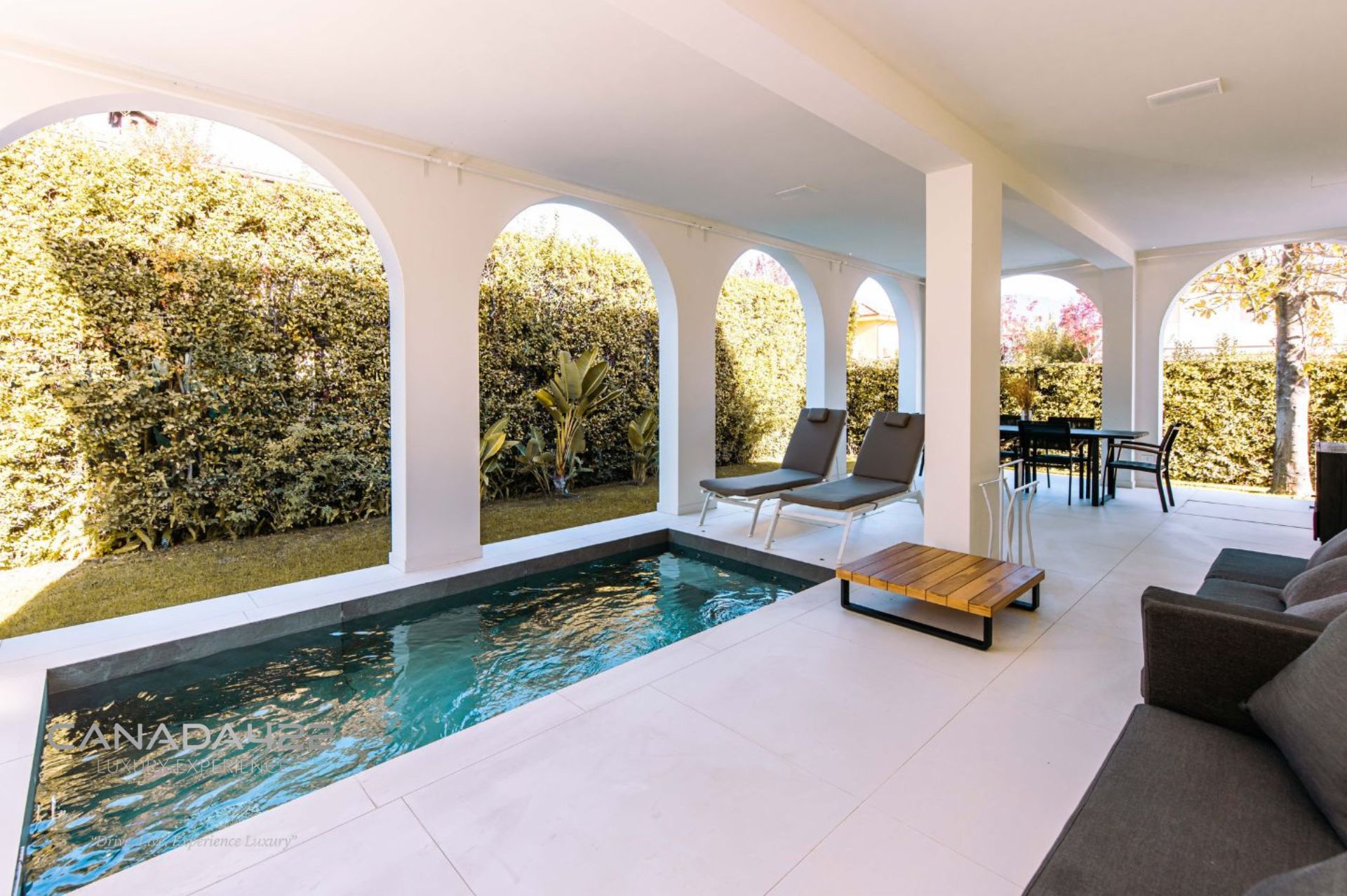 At the back of the villa is an elegant and secluded relaxation area, with a mini-pool with hydromassage, sun loungers, and outdoor dining area, perfect for enjoying Versilia in total comfort.