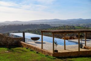 The main residence houses seven fully independent master suites, featuring distinctive architectural details such as travertine mullioned windows with two lights, stone fireplaces-sometimes also found in bathrooms-private terraces with 360-degree views and heated stone floors. The interiors, embellished with bespoke handcrafted furnishings, span some 5,000 square meters. An additional room, a refined spa and a scenic 33-meter infinity pool complete the property.